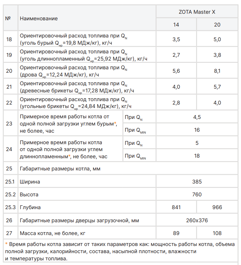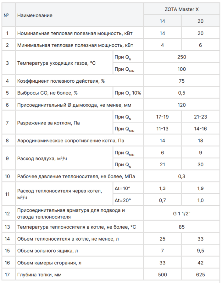 Технические данные твердотопливных котлов ZOTA Master-X 20 (20 кВт):